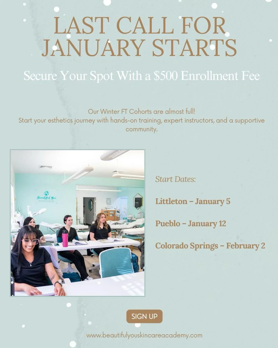 As a skincare studio & esthetician training facility we train & hire the best of the best students right upon graduation and licensure. This allows us to continue our mission of elevating the industry by focusing on education and promoting a collaboration over competition mindset in our business. We are a collaborative team of licensed skincare & medical professionals who’s main goal is to help YOU look & feel BEAUTIFUL. As a client of Beautiful You, you will see that our clients will always come first. There is no competition or territorial mindset of who’s client belongs to who. In our business we support, inspire and empower each other, making sure to always put our clients needs above our own. You will love our ethos and positive team culture, it is one you won’t find in any other spa setting in Pueblo. We love sharing clients between one another, and supporting our entrepreneurial estheticians when they feel inspired to venture out on their own. We love empowering our team and we absolutely love promoting self care! Learn more about us and please don’t hesitate to reach out if you have any questions about our Skincare Studio or Academy.